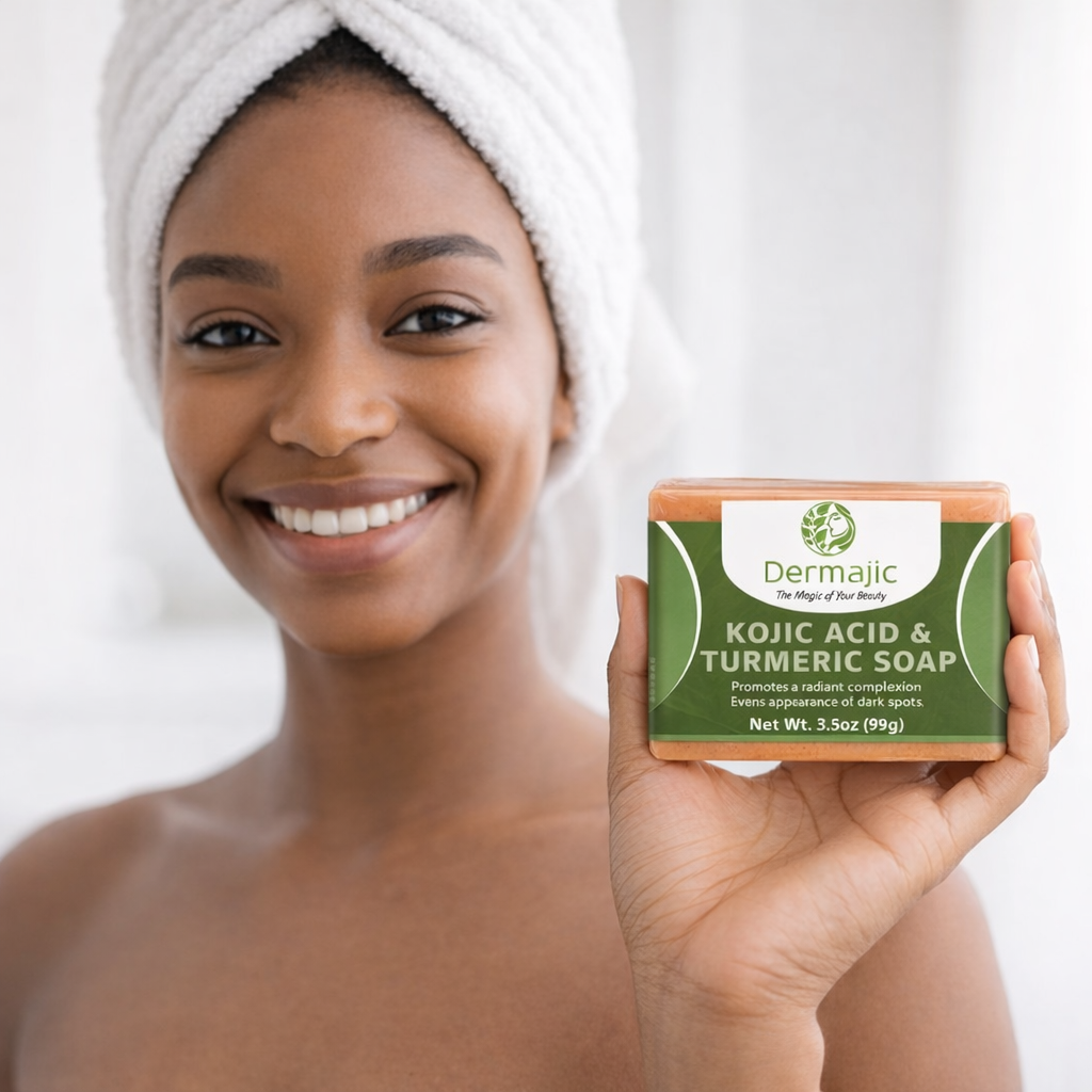 Dermajic Kojic Acid & Turmeric Soap is a gentle brightening cleanser designed to help improve skin clarity, promote a more even complexion, and restore your natural glow — without harsh stripping.